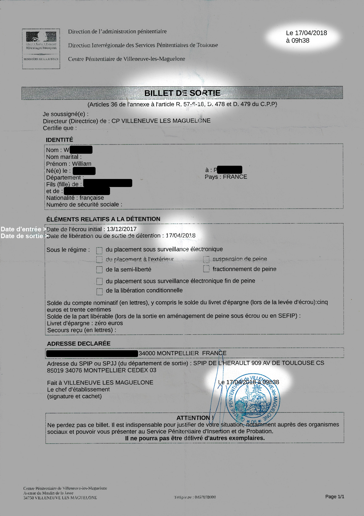 — 17 avril 2019: un courrier recommandé (envoyé par l'auteur à la juge) pour connaître l'identité de la policière malhonnête ayant falsifié le dossier d'enquête arrive au tribunal de Montpellier,